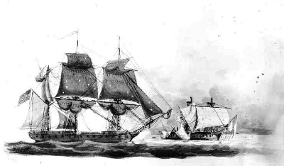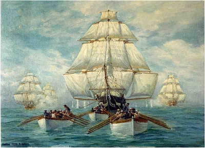 Die USS Constitution entkommt der britischen Flotte, indem sie sich in einer Flaute von ihren Beibooten wegschleppen lässt.