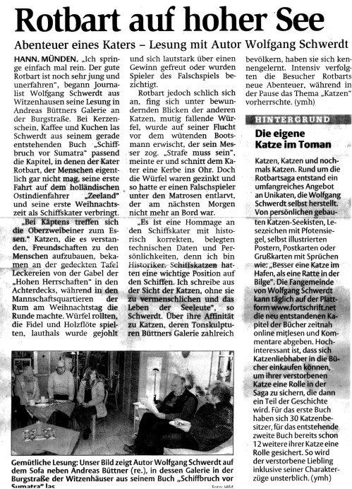 Thema der Lesungen war mein damals noch nicht erschienenes Buch „Schiffbruch vor Sumatra“, also der zweite Band der Rotbartsaga über den legendären Schiffskater aus dem 17. Jahrhundert. Folgenden Bericht der HNA Hann. Münden möchte ich Ihnen nicht vorenthalten und erlaube mir darauf hinzuweisen, dass es im rechten Infofeld natürlich „Roman“ statt „Toman“ heißen soll.