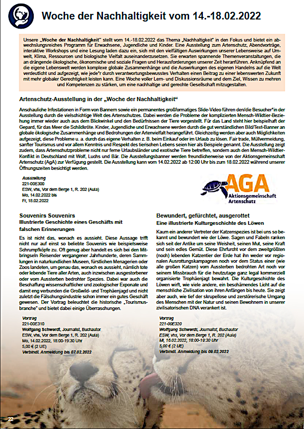 Und so freue ich mich, gleich mit drei Beiträgen dabei sein zu dürfen: Dem Vortrag Souvenirs, Souvenirs; Dem Vortrag „Bewundert, gefürchtet, ausgerottet“ und der literarischen Reise in Wort und Bild „Von Panthern und anderen wilden Tieren.“