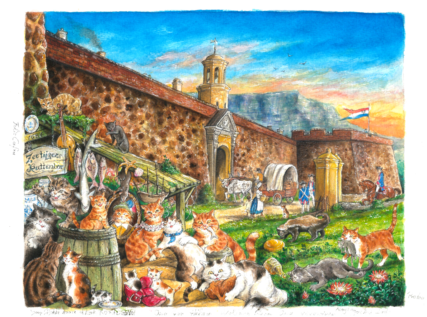 Die Anregung zum Motiv einer Katzentaverne hatte sich Jonny aus meiner Buchreihe „Die Rotbartsaga“ geholt und da es „historisch“ bekanntlich enge Verbindungen zwischen den Schiffskatzenlinien von Jonnys Catpickles und Greenhoods (1. Band Schiffskater Pixie) und den Schiffssamtpfoten der Rotbartsaga gibt, hatte Jonny seine Kapstadttaverne zu Ehren Seetigers, Rotbarts Mentor und Gründer von Seetigers Schiffskatzentreff (1. Band Rotbartsaga) eben Zeetijgers Kattenbar genannt. Und um das alles Perfekt zu machen, findet sich sogar ein Portrait des legendären Schiffskaters Rotbart im „Gerümpel“ des verfallenen Tavernenschuppens.