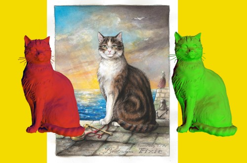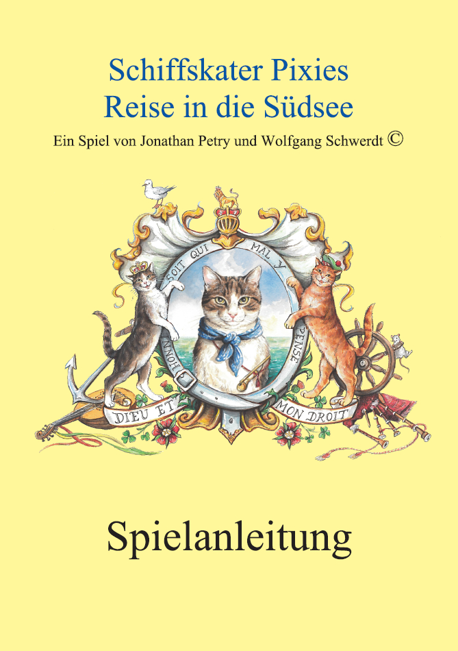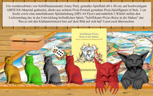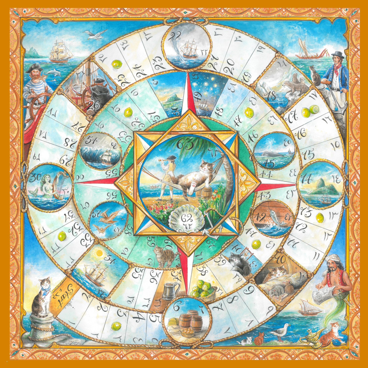 Nein, ich finde es überhaupt nicht ungewöhnlich, dass sich ein Buchautor auch mit dem Entwickeln von Spielen beschäftigt. Erst recht nicht dann, wenn ihm sein Freund und Kooperationspartner, der Schiffskatzenmaler Jonny Petry, neben den Illustrationen für die gemeinsamen Bücher überraschenderweise mal so nebenbei ein wunderschönes gemaltes Spielfeld präsentiert. Nein, da kann ich einfach nicht anders, zumal die Abbildungen auf dem Feld dem zweiten Band unserer gemeinsamen Buchreihe „Schiffskater Pixie, mit James Cook um die Welt“ entlehnt sind.