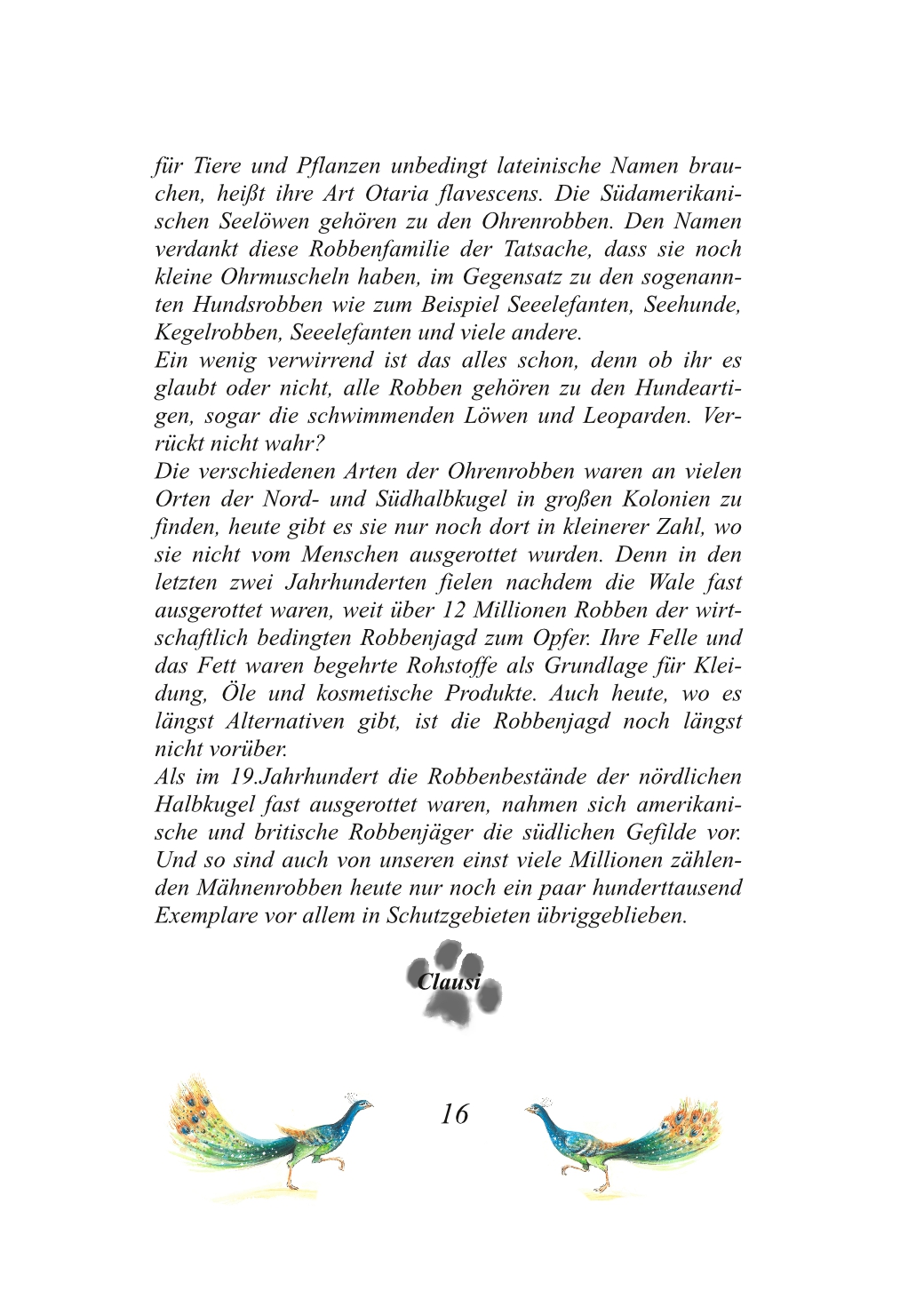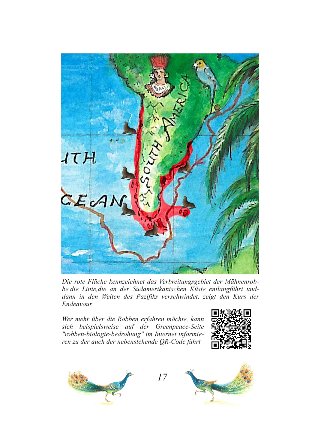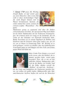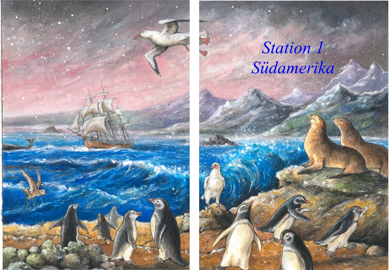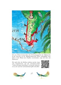 Ganz „normal“ hingegen ist die aufwändige und liebevolle Gestaltung des Buches. Insgesamt 20 Tierarten (jeweils vier pro Station), denen Schiffskater Pixie auf seiner Reise mit James Cook begegnet ist, stellen euch Pixie und seine sesshaften Nachfahren in diesem Buch vor. Jeder Tierart sind dabei vier Seiten gewidmet und so sieht das dann beispielsweise aus.