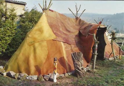 1) Errichten von und Campen in Zelten, die unterschiedlichen steinzeitlichen Behausungen nachempfunden sind.