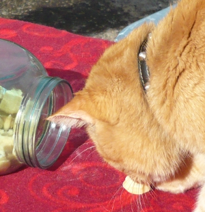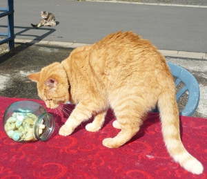 Los für Los fischte der Glücksfeekater mit seiner geschickten Pfote aus dem Glas, genauestens beobachtet von nur scheinbar desinteressiertem Publikum, darunter Findus, ebenfalls lukullischer Experte aus Sonjas Katzenclan.