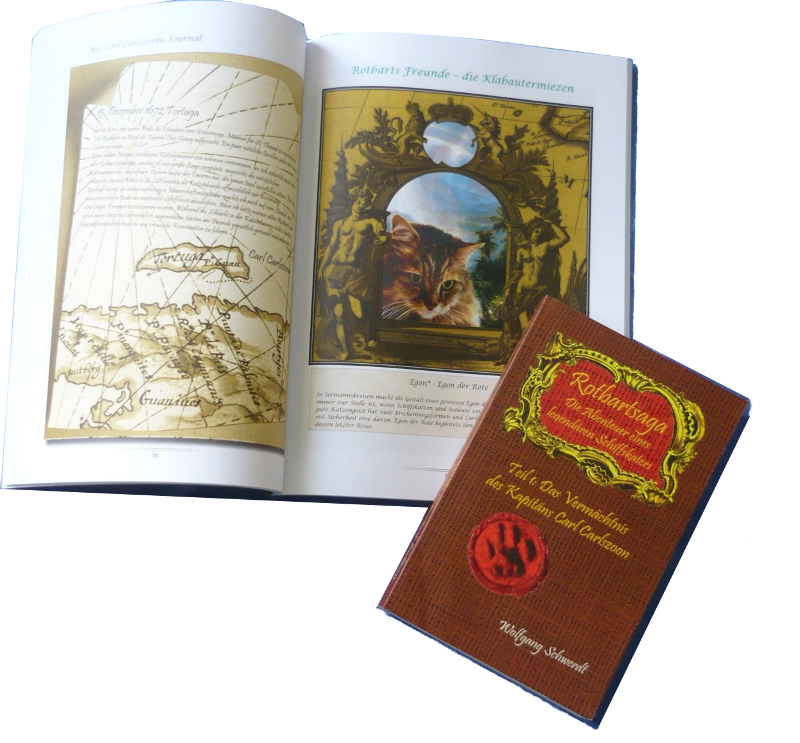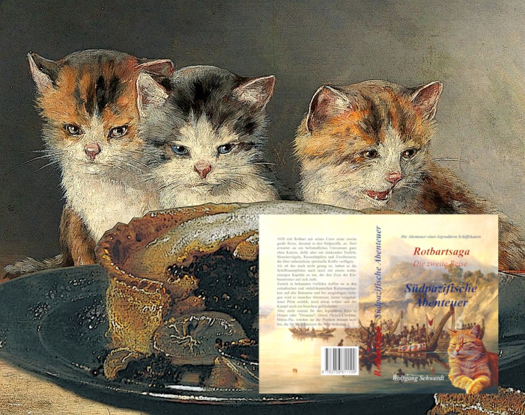 Rund 360 Jahre früher: Wir befinden uns an Bord der Seeker des englischen Kapitäns Dampire. Der hatte den niederländischen Kapitän Carl Carlszoon mit seiner Zoeker irgendwo an der Küste Neuguineas zum Dinner an Bord seines Schiffes geladen und seinen Gästen dabei den in Seefahrerkreisen damals legendären Käpt’ns Dream serviert. Den historischen Quellen (Dritter Band meiner historischen Schiffskatzenreihe „Rotbartsaga“) nach handelte es sich dabei um einen Fleisch-Käse-Minze-Pie, wie der folgende Auszug aus „Rotbartsaga. Südpazifische Abenteuer“ bereits andeutet: Lesen Sie weiter in der Schiffskatzentaverne